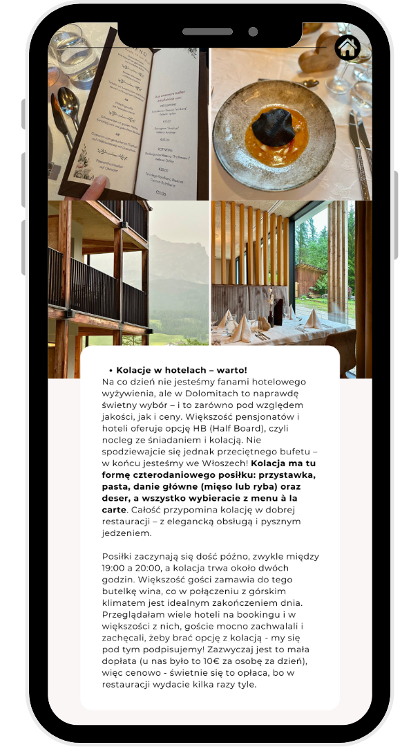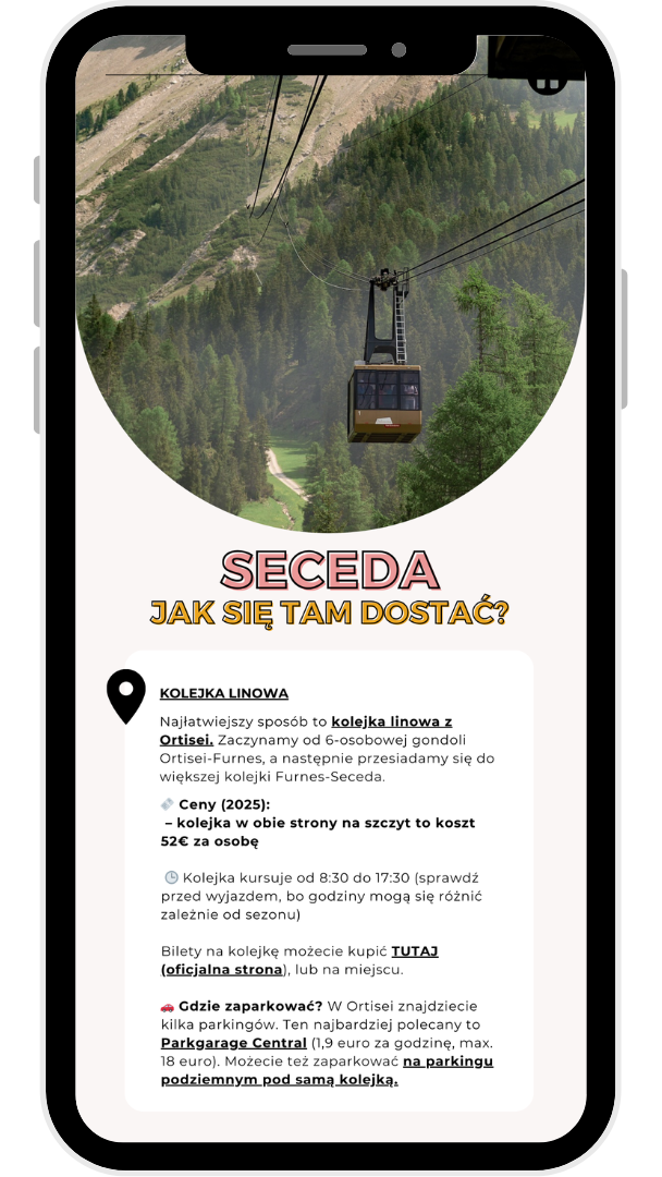 Ponad 100 stron praktycznych wskazówek i sprawdzonych miejsc, które pomogą Ci zorganizować wymarzoną podróż krok po kroku – bez marnowania godzin na planowanie. W środku znajdziesz gotowy plan podróży na 6 dni w Dolomitach i 4 dni nad jeziorem Garda, szczegółowe opisy najpiękniejszych szlaków, miasteczek, plaż, atrakcji i punktów widokowych – wszystko uporządkowane dzień po dniu. Dodatkowo, praktyczne informacje dotyczące lotów, wypożyczenia auta, winiet i parkingów, cen, aplikacji i biletów, a także moje sprawdzone wskazówki i polecenia noclegów oraz restauracji. Do przewodnika dołączona jest interaktywna mapa Google Maps z pinezkami, podzielonymi na kategorie. Wszystko zebrane w jednej, kompaktowej formie – idealnej na telefon.